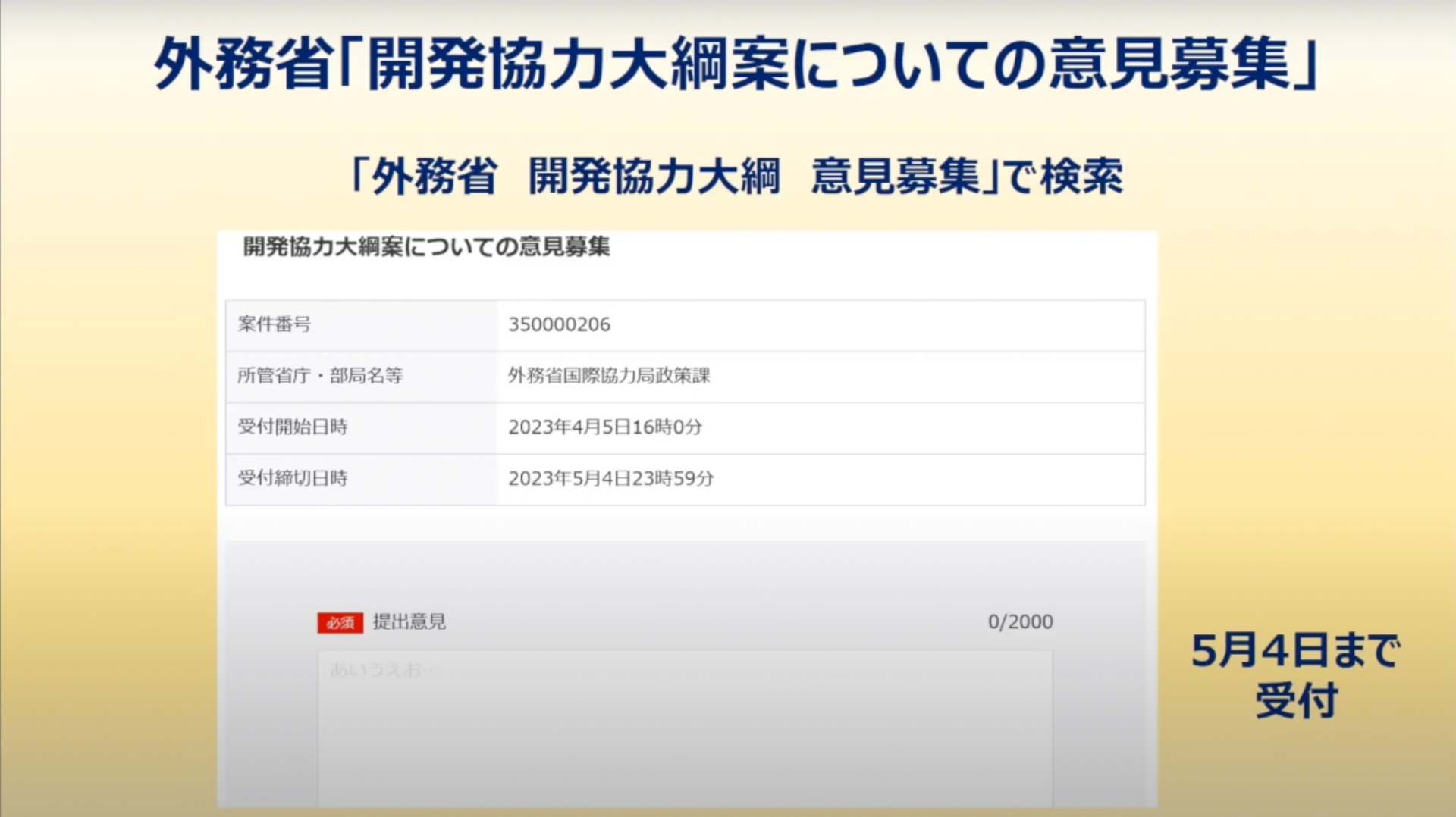外務省は、4月5日に開発協力大綱の原案を発表し、同日から5月4日までの1ヶ月間を意見募集(パブリックコメントの募集)としています。新たな大綱策定に向けてなるべくの多様な市民の声を反映させるべく、是非積極的にご意見を出していきましょう!