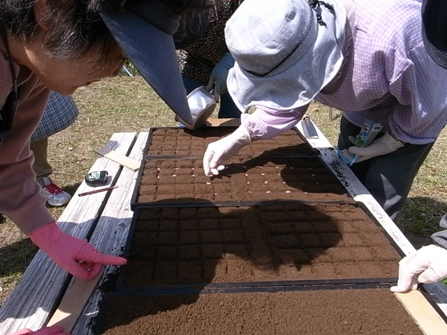 5月初旬、浦島小学校・仮設住宅の住民の方々とナス、かぼちゃ、ミニトマト、きゅうり、トウモロコシなどの苗づくりを行いました。講師は元農協職員の浦島小学校の用務員さん。野菜ごとの生育の違いや種の蒔き方を教わり、長年畑作業をしてきた住民の方々も「なるほど、なるほど」と新しい学びがあったようです。