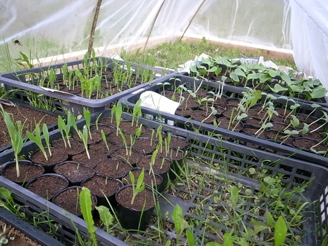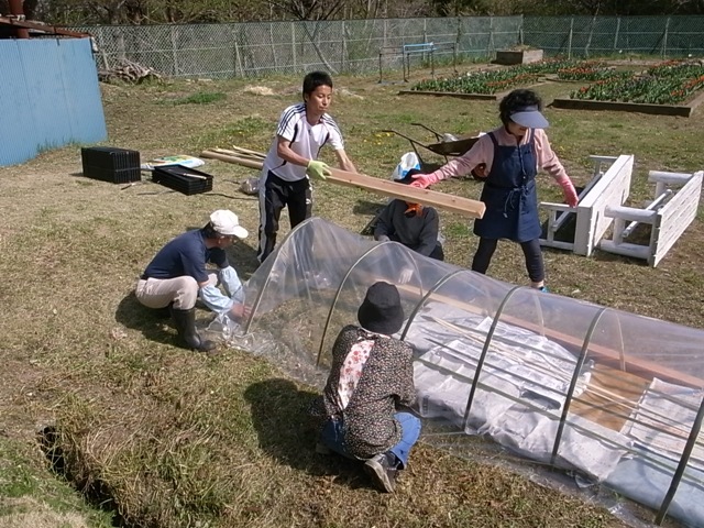 種まきが終わったら、ビニールシートで作ったトンネルの中に入れておきます。トンネルの中は外気より温度が高いため、早く発芽します。発芽までの期間は種類によって異なりますが、トウモロコシやかぼちゃは発芽が早く、10日くらいで芽を出しました。仮設住宅の住民のお母さんたちも野菜の生育が気になるようで時々トンネルの中の様子を覗いていました。またJVC気仙沼事務所の大家さんからレタスの苗を分けて頂いたので畑に植えることにしました。