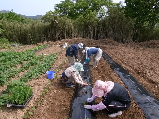 5月下旬には定植の時期を迎えたかぼちゃやトウモロコシ、サヤインゲン、きゅうりの苗を畑に植えました。石灰や肥料を撒き、うねを作り、マルチで覆います。ひとりでやると大変な作業も仮設住宅の住民の方々で協力してやると半日で終わってしまい、住民の方々も「大勢でやると楽しいし、あっという間だね」とおっしゃっていました。畑には先日植えたジャガイモやネギが立派に育ち、賑やかになってきました。