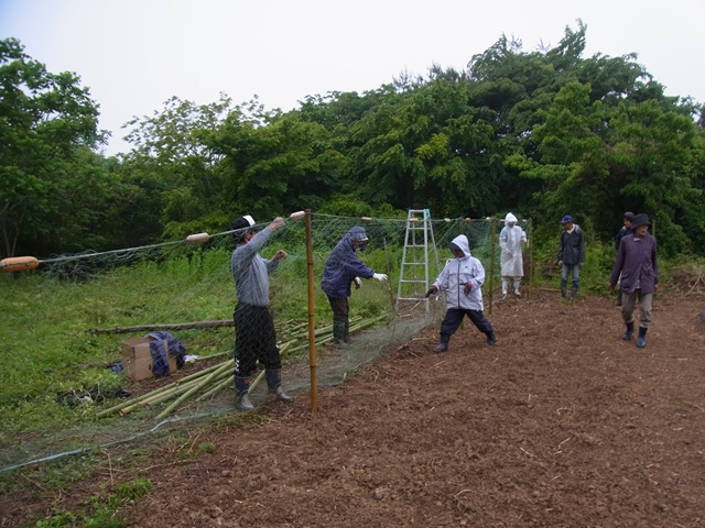 ところが、定植して数日たった後、事件が発生しました。トウモロコシときゅうりの苗をカモシカに食べられてしまったのです。慌てて、住民の方々、有志で手伝ってくれた千葉県の農家の方、JVCスタッフでカモシカ対策のためのネットを張ることになりました。まずは必要になる資材の調達です。住民の漁師さんから使わなくなった魚網とロープを頂き、浦島小学校の用務員さんから竹やぶの竹を分けて頂きました。雨が降りしきる中、竹を切りだし、皆さんで運び出します。竹を適当な長さに切りそろえ、竹の支柱を作り、網を張っていきます。漁師さんが慣れた手つきで竹の支柱に網を結んでいき、頑丈なカモシカ除けネットが完成しました。