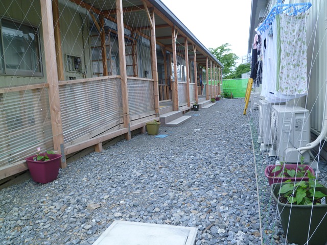 住民のみなさんにも道具や資材を持ち寄ってもらい大工仕事をすること2時間あまり。見事玄関側通路にもネットを設置することが出来ました!ユウガオが悪天候に負けず無事に育てば、向かいのおうちの窓側のネットとあわせて緑に覆われた空間を作ってくれることでしょう。