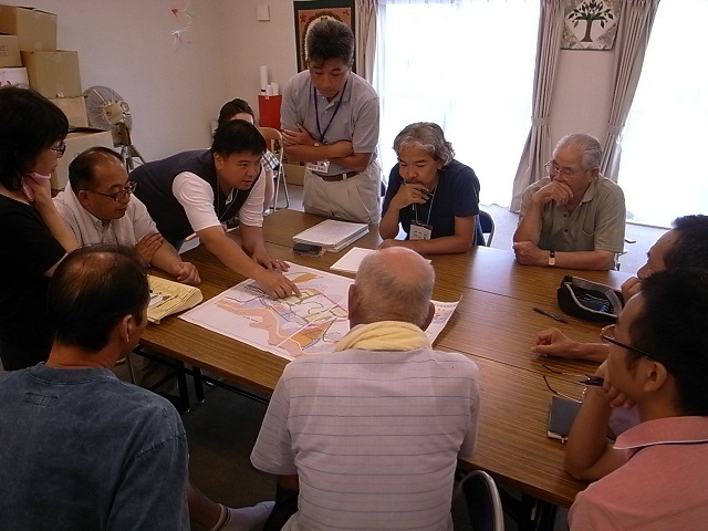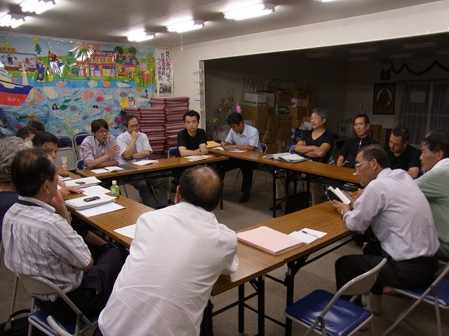 8月24日、市役所やコンサルタント会社を訪問し、担当者から事業の現状と今後のスケジュールについての確認を取りました。続いて、3地区(大浦、小々汐(こごしお)、梶ヶ浦(かじがうら)の代表者が集まってミーティングの場を持ち、地区に共通する課題についての話し合いが行われました。ミーティングでは、建設業者の不足が懸念される中で、造成後いかにすみやかに住宅を建てるかという点や、現在進行している大規模な道路事業や防潮堤の問題、さらには四ヶ浜全体に関わる振興計画まで話は及びました。