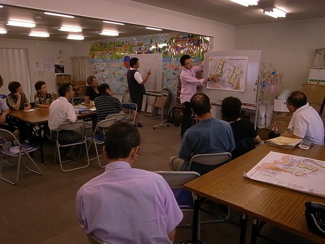 8月25日、それぞれの地区において第2回目の住宅相談会を行いました。相談会ではまず、行政からのヒアリングを元に、今後の事業のスケジュールを住民の皆さんに説明しました。スケジュールの説明では特に、最終的な設計に入るタイミングと要望を提出する時期を確認しました。また、現段階で示されている設計図について、アドバイザーが分かりやすく解説を行いました。その上で、住民の皆さんから、造成地に関する要望の聞き取りを行いました。