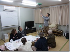 11月25日、西中才・仮設住宅で勉強会を開催しました。勉強会では、まず初めに「どうして結露が発生するのか」を住民の方々に理解してもらい、結露対策に関して住民の方々と意見交換を行いました。結露の発生を抑えるためには、まず普段の生活を見直すことが重要です。日常生活の中でも、料理や入浴などで多量の水蒸気が発生しているため、「換気」や「除湿」、「水蒸気の発生を抑えること」を心がけるだけでも、大きな効果が期待できます。また、住民の方からも「市販の除湿剤で良い物があるよ」という声や「以前は台所やトイレに結露が出ていたけど、換気扇を回すようになったら(結露が)出なくなったよ」という経験談など、実践的な結露対策について様々な意見が出されました。