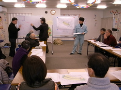 一方、大浦の相談会では、住民の要望を反映した造成設計図の修正案が複数提示されました。これを受けてアドバイザーからは、それぞれの設計図のメリット・デメリットが解説されました。住民とアドバイザーとの間の質疑応答や意見交換を経て、最終的に住民が希望する設計図が決定されました。