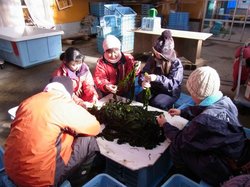 当日は、養殖の作業体験から始まりました。作業の一つはいわゆる「芯抜き」と呼ばれるもので、塩蔵ワカメ(保存のため湯通しをして塩をまぶしたワカメ)を、葉と茎の部分に分けていきます。また、生のまま出荷するワカメについては、メカブと葉の部分を茎からそぎ落とし、袋詰めにしていきます。参加者は、地元の方から道具の使い方などの手ほどきを受け、見よう見まねで作業を進めていきました。