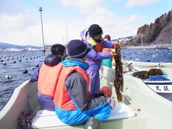 JVCが活動する鹿折地区・四ヶ浜(しかはま)では、牡蠣、帆立貝、ワカメ、コンブの養殖が盛んに行われています。この度、ワカメの収穫時期となる2月~4月にかけて、地元の養殖業者の協力を得て、養殖体験を3度実施しました。体験を通じて生産者と消費者を結びつけることで、地域の養殖業の活性化を図るとともに、養殖業への理解者を増やすことがその目的です。