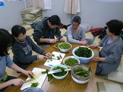 作業終了後、収穫したばかりのワカメを使った料理を作りました。参加者が住民の皆さんと一緒になって、それぞれの部位に合わせた調理をしていきます。もともとは黒っぽい色をしたワカメが、火を通した途端に鮮やかな緑色に変わると、驚きの声があがりました。参加者は、テーブルの上に並べられた様々な料理を通して、新鮮なワカメの味を堪能していました。