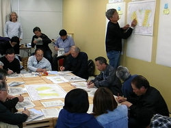 小々汐地区では、最終段階に入った造成地の詳細設計図面と移転用地の取得へ向けた手続きの進捗状況が報告されました。この地区では、抽選によって各世帯の区画を決定することがすでに合意されていますが、抽選に先立ち、移転地全体の利便性や安全性についての協議が市職員を交えて慎重になされ、今日までに様々な要望を伝えてきました。出入り口の位置や壁の形状などに統一性を持たせ、各区画の公平性がある程度保たれるなど、様々な条件が整ったのちに、いよいよ抽選に入っていくことになります。