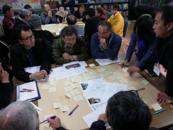 アドバイザーの説明に続き、住民がもつ家づくりのイメージをさらに引き出すワークショップを行いました。住民からは「住宅の大きさや価格のイメージがまだ掴めない」との声があがる一方で、「断熱性能の優れた、夏涼しくて冬暖かい家がいいわ」「太陽光パネルと一体の瓦にしたいな」など、将来の家に対する希望が思い思いに語られました。勉強会の最後には、住民の関心が高い耐震と断熱をテーマとして、アドバイザーから説明が行われました。