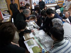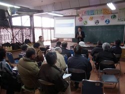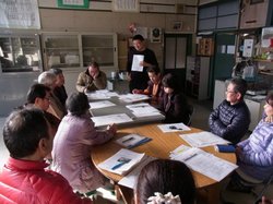 各地区の話し合いに続いて、三地区合同の「四ヶ浜の家づくり勉強会」を開催しました。はじめに、金融機関による融資に関する説明会を行いました。ここでは特に、住宅金融支援機構の「災害復興住宅融資」のメリット・デメリットが解説されました。