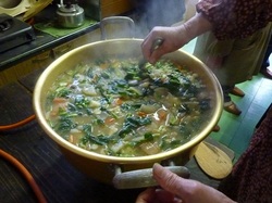 当日、会場へ移動している最中、道端で住民の方とお会いし、「○子ちゃんと待ち合わせしているの。大根とじゃがいも持っていくからね」とお料理会を楽しみにされている様子でした。参加者は女性の方が多く、いわば地域の「お母さん方」がたくさん集まりました。会場の台所にはそれぞれの畑で採れた野菜が並んでおり、野菜を切る係や炒める係など、皆さんで上手に役割分担されていました。