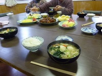 美味しそうな「けんちん汁」が出来上がり、食事の時間になると皆さんは料理の話や最近の出来事など、世間話で盛り上がっていました。また、野菜の他に各家庭で作った干し柿や漬け物を持参された方も多く、漬け物の食べ比べをして楽しまれていました。
