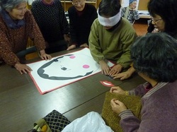 美味しい食事と世間話に花が咲いた後は、新年ということで「福笑い」を行いました。ほとんどの方が「福笑い」で遊ぶのは子供の頃以来と話しており、それぞれが目隠しをして作った可笑しな顔を見て、皆さんで大笑いしていました。