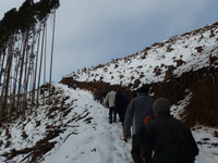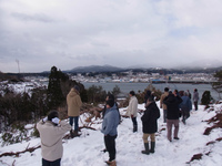 地鎮祭終了後、移転予定地の見学会が行われました。前日に降り積もった雪が辺りに残る中、険しい坂道に沿って高台へと歩を進めました。移転予定地に辿り着くと、眼下には美しい内湾の景色が広がっていました。「素晴らしい眺めだね」「思いの外、風は強くないな」。移転予定地に足を運んだ住民は、将来自分たちが住む場所に対する印象を思い思いに語り合っていました。