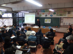 午後、旧浦島小学校にて大浦地区の会合が開かれました。会合の席上、「まちづくりルール」の運用に対する要望が住民の一人から出されました。大浦地区では、「宅地南側については『南側セットバックゾーン』を設定し、建築物がはみ出さぬよう計画、建設すること」というルールが全体に対して平等に定められました。しかし今回、敷地の形状によっては駐車スペースを充分に確保することが困難な宅地が生じるため、南側に隣接する宅地のない=ルール緩和によって迷惑を受ける宅地のない一部の区画に限り、ルールを緩和してほしいという要望が出たのです。話し合いの結果、ここは「申し合わせ」というルールの柔軟性を生かし、「前後左右の近隣住民に相談し了解を得ること」を条件にルール適用の部分的な緩和が認められました。また、緑地帯の活用方法、景観に関わる立木の伐採、ゴミ集積所及び夜間防犯灯の位置など、まちづくりに関わる諸点についても検討が行われました。