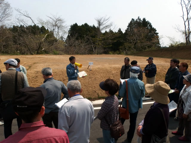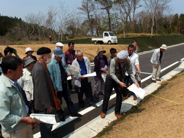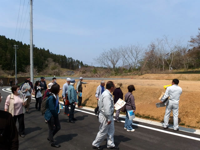 4月27日、防災集団移転のアドバイザー派遣を実施しました。今回は、他地区で先行して完成した高台移転団地の見学会を開催し、大浦(おおうら)地区・梶ヶ浦(かじがうら)地区合わせて約30名の住民の参加を得ました。