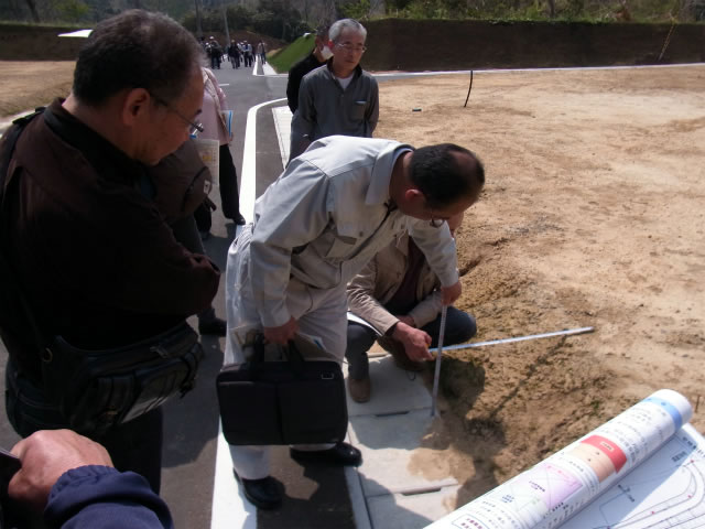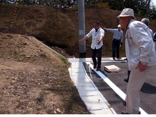 宅地への乗り入れ道路の幅を確認する住民とJVC山崎(写真中央)