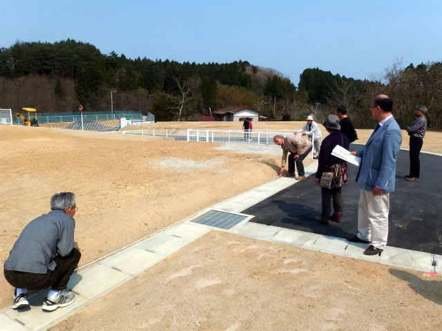 続いて午後には、気仙沼市・本吉町に位置する団地を訪問しました。ここでは主に、公園や緑地の様子を見学しました。公園や緑地については大浦地区や梶ヶ浦地区でも同様のものが整備される予定となっています。住民からは「公園や緑地のよりよい活用方法を考えて、適宜要望を出していこう」との声があがりました。その他、擁壁(ようへき)の形状や間口の広さなどを確認する場面も見られました。
