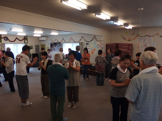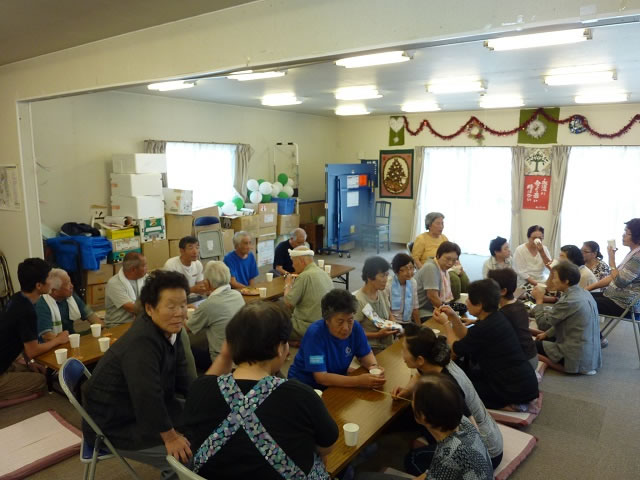 第1回目となる6月のイベントでは、地元の講師を招いた「健康体操」を行いました。当日は、4ヶ所の仮設住宅の住民が集まり、鹿折地区の集合型災害公営住宅の入居予定者については、11名の参加を得ました。二人一組で体を動かす場面では、初対面の方々でも動きを合わせて楽しんでいる様子がみられました。また、健康体操の終了後には、お茶会を行いました。イベント終了後、参加者からは、「初めて会う人と話せて楽しかった」などといった感想が聞かれ、また、帰り際には、「また会いましょうね」と声を掛け合う方々がみられました。