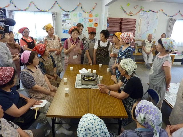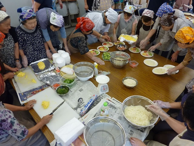 第2回目となる7月のイベントでは、栄養士会の方々にご協力頂き「お料理会」を行いました。今回も4ヶ所の仮設住宅の住民が参加され、鹿折地区の集合型災害公営住宅の入居予定者については、12名の参加を得ました。調理の際には、初対面の方々でも協力し合う様子がみられました。