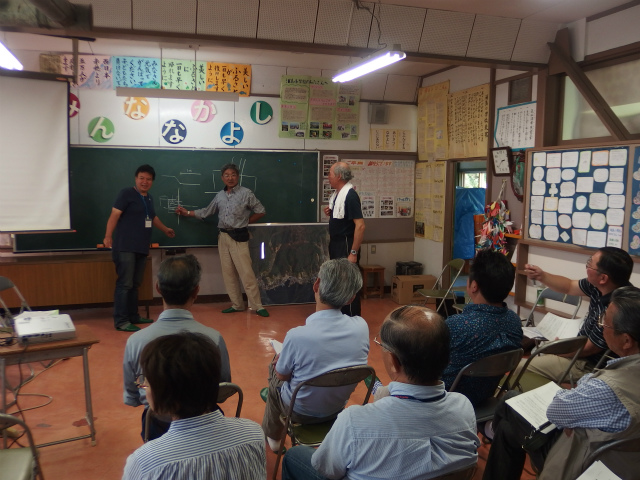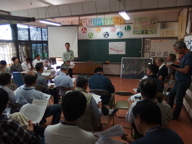 午後からは旧浦島小学校に場所を移し、大浦地区の総会が開催されました。総会では、市・県・工事業者によって造成工事の進捗状況と今後の予定が説明されました。住民からは「1ヶ月あたり平均してどのぐらいの量の土を運び出すのか?」「狭い道を多くの工事車両が通ることになる。一日に何台のダンプトラックが行き来するのか?」といった質問が投げ掛けられました。また、「造成工事に遅れが生じないように、道路工事と造成工事を一体にして進めてほしい」「造成完了後すぐに住宅の建築を始められるように、事務的な手続きを簡略にしてほしい」といった要望が出されました。