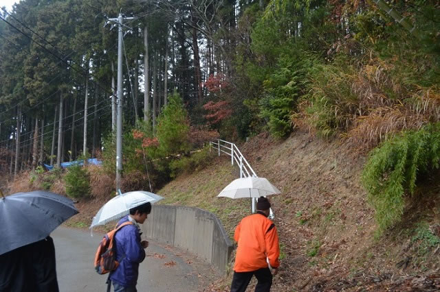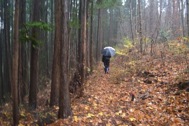 道の左側は植林された杉林。右側は天然の松林。昔は小学校への通学路だったそうです。