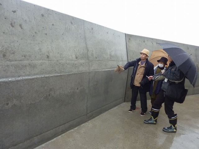 参加者は地元の案内人にどんどん質問を投げかけます。震災後に高くなった防波堤の前で。