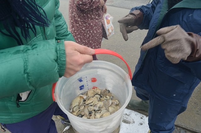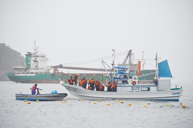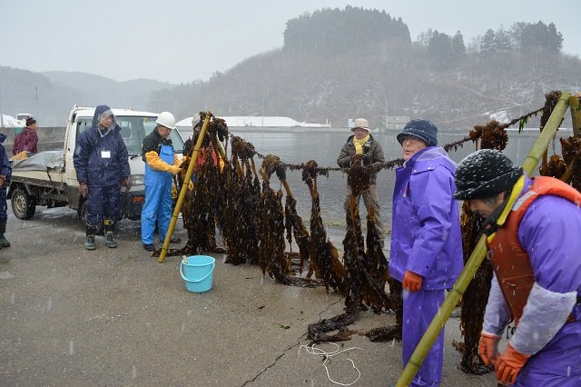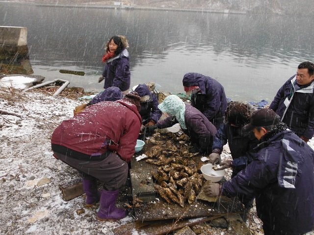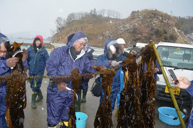 さらに、2日目の午前には海上見学や牡蠣の殻むき体験も行いました。海上見学では、漁師さんに海に出てきていただき、ワカメの刈り取り作業の様子を見せていただきました。雪が降りしきる中での実施となりましたが、実際に船に乗って、海上からワカメの刈り取りを間近に見た参加者からは、感嘆の声が上がりました。