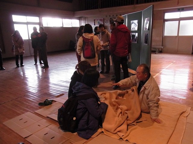 まちあるき体験の後は、2013年3月をもって閉校となった旧浦島小学校(以下、旧浦島小)に移動して、地元の語り部から震災当時の体験談を聞きました。東日本大震災の発生後、旧浦島小の体育館は避難所として活用されましたが、その時の様子を段ボールを使って再現し、参加者に避難所生活の様子を実際に体験していただきました。