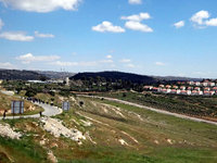 村のすぐ隣に見える、オレンジ屋根の入植地