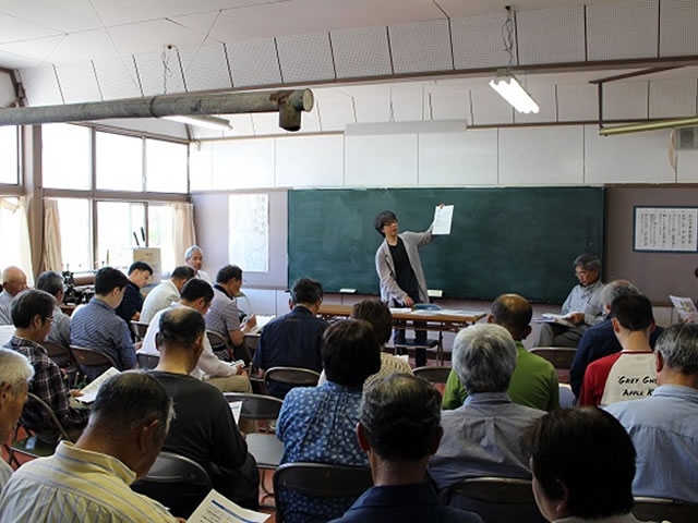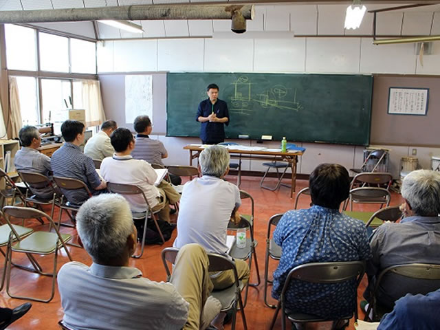 見学会終了後、旧浦島小学校にて総会が開催されました。総会でははじめに、コンサルタント会社から応急仮設住宅の備品譲渡に関する手続きや住宅移転に係る補助事業についての説明が行われました。また、水道管の引き込み位置の調整、電柱とアンカーの設置箇所の確認、団地の植栽についての検討などがなされました。