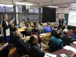 今回の講演会では、約30年前から浦島地区の歴史や民俗に関する研究を行っている東北大学教授の川島秀一氏を講師として招きました。はじめに川島氏から「人々の暮らしを取り戻す上で『人々が震災前にどのような暮らしを送っていたのか』、『どういうところに喜びを感じて生活をしていたのか』という点に目を向けることが大切」というアドバイスがありました。その後、川島氏から、これまでに出会った人々とのエピソードを交えながら浦島地区の漁業の歴史や特徴に関する説明が行われました。また、震災前に撮影された写真をもとに地域で行われていた様々な年中行事の様子が紹介されると、参加者からは当時を懐かしむ声が上がりました。講師の説明の後には、参加者から漁業に係わる風習についての質問や「地域の歴史や文化を見直すことができた」といった感想が寄せられました。