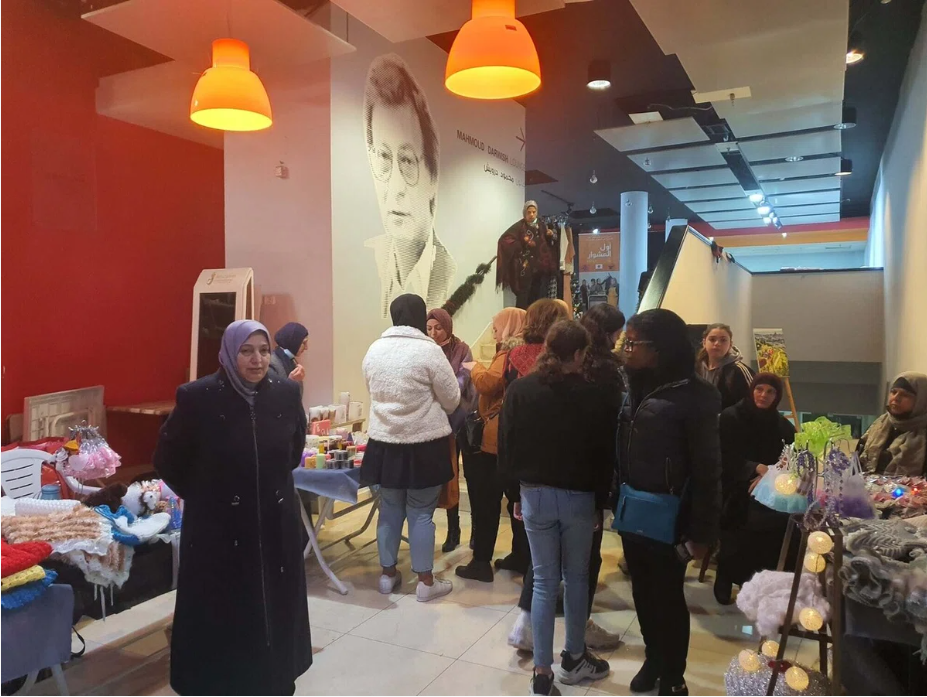 バザーの会場は東エルサレムでも繁華街。道路の両側にさまざまなお店が立ち並び、人通りも多い立地です。カフェ脇の入り口から入ると、つきあたりのテーブルでJVCと現地パートナー団体(AWC)のスタッフがお出迎え。