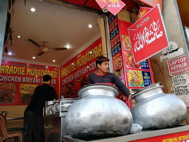 さてその次の日のお昼、ホテルの周りにあるお店にも、食べ物を探しに行きました。すでにアフガン人同僚もデリーに到着しています。彼らはイスラム教徒なので、ハラールフード(イスラム法において許された食事)のお店を探します。いつも出張で彼らに会うときに感心するのですが、異国でのアフガン人のサバイバル能力(?)が発揮され、すぐにハラールのお店が見つかりました。さすが、情報収集が速い。インドの人々ともウルドゥー語である程度会話しているようです。