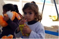 ガザ南部、ラファのテル・アル・スルターン地区と、ブラジル・キャンプにある2つの幼稚園を訪れました。JVCは現在、ガザの北部(ウム・アル・ナセル村)、ガザ市、ガザ南部のラファでは3つの幼稚園、計5つの幼稚園で、子どもたちに毎日栄養強化牛乳とビスケットの配布を行っています。