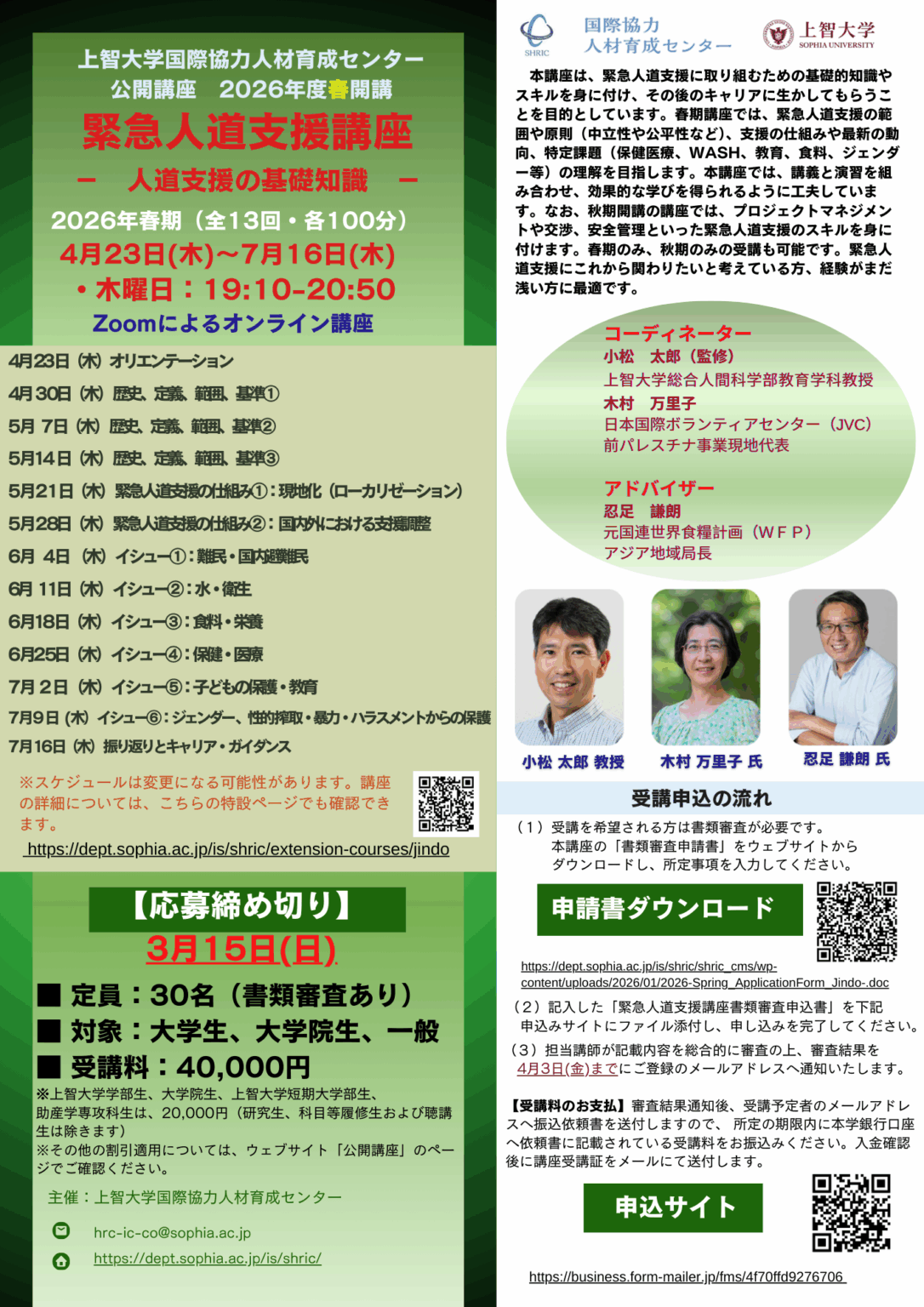 2026年4月23日(木)より開講する上智大学国際協力人材育成センター主催のオンライン公開講座「緊急人道支援講座ー人道支援の基礎知識ー」で、JVCスタッフ・木村万里子がコーディネーターを務めます。